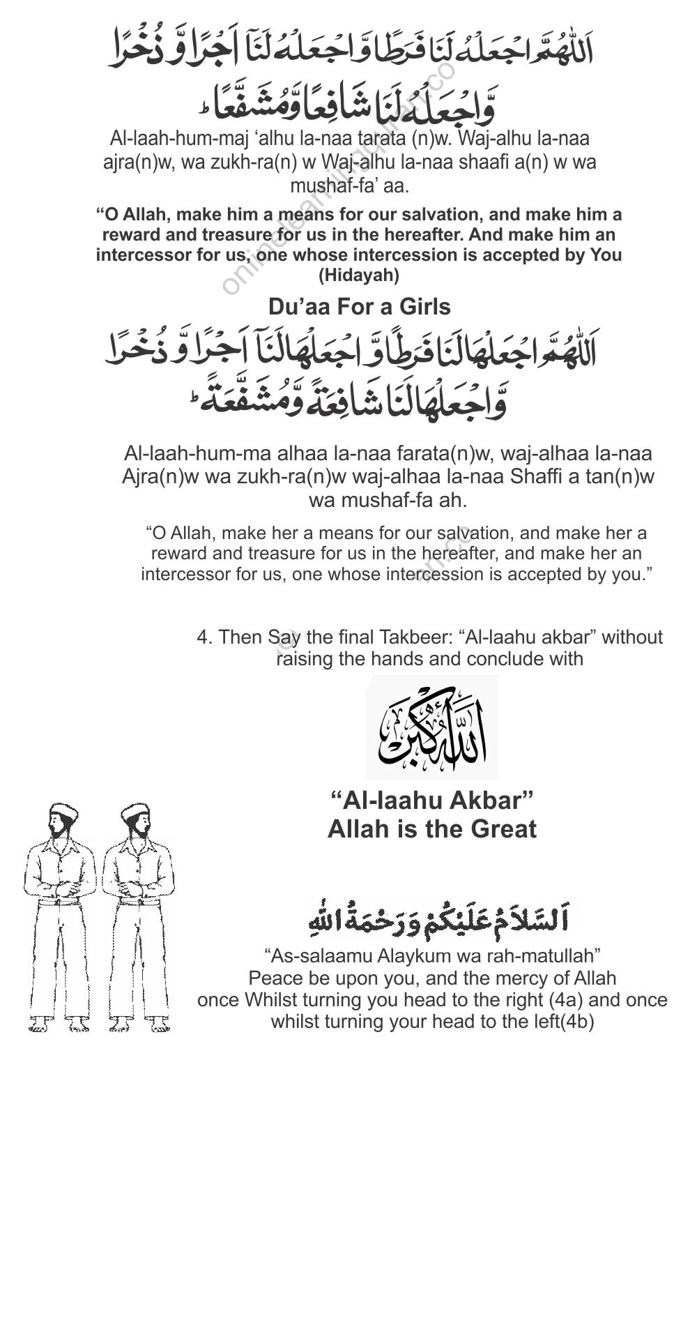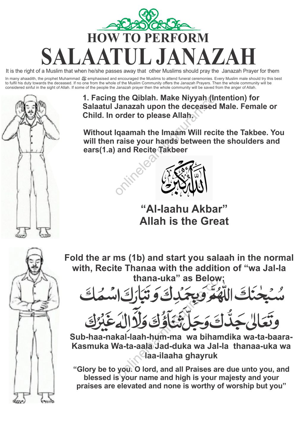 نیت : مقتدی کہے کہ میں اس طرح نیت کرتا ہوں اس نماز جنازہ کی واسطے اللہ عزوجل کے دعا اس میت کیلیے پیچھے اس امام کے اب امام ومقتدی پہلے کانوں تک ہاتھ اٹھائیں اور اللہ اکبر کہتے ہوئے فورا حسب معمول ناف کے نیچے تک باند ھ لیں ۔